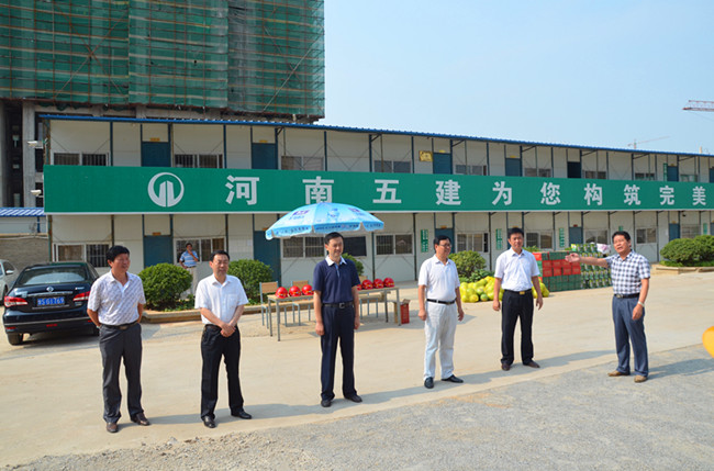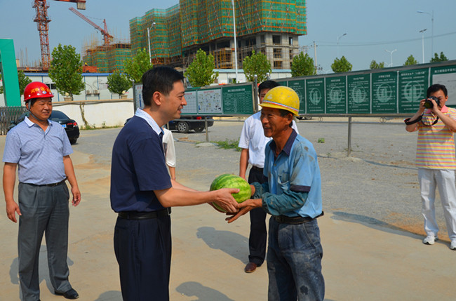 信陽(yáng)市經(jīng)過(guò)前段時(shí)間的強(qiáng)降雨后,近期卻是持續(xù)的高溫天氣,驕陽(yáng)似火,夏日炎炎,室外氣溫高達(dá)36℃以上,對(duì)于施工現(xiàn)場(chǎng)作業(yè)的農(nóng)民工來(lái)說(shuō)是對(duì)體力和毅力的挑戰(zhàn)。針對(duì)這一情況,2013年8月2日上午9:00,信陽(yáng)市總工會(huì)由李強(qiáng)書(shū)記帶隊(duì)的慰問(wèn)小組頂著炎熱的烈日,到我公司龍?jiān)疵讽?xiàng)目部去看望施工現(xiàn)場(chǎng)的農(nóng)民工,為我公司戰(zhàn)斗在施工生產(chǎn)一線(xiàn)的農(nóng)民工送來(lái)了防暑降溫的物品。