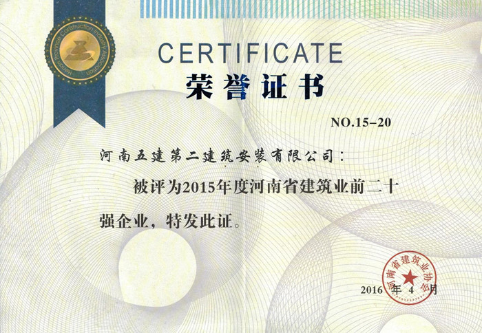 熱烈祝賀公司榮獲“2015年度河南省建筑業(yè)前二十強企業(yè)”