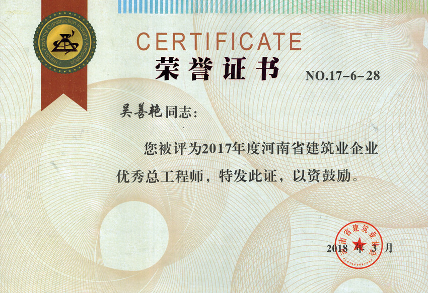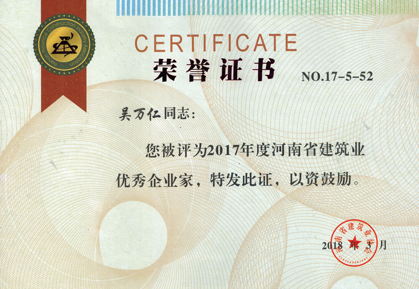 近日,河南省建筑業(yè)協(xié)會發(fā)布公告,公司榮獲2017年度“河南省建筑業(yè)前二十強企業(yè)”、“河南省建筑業(yè)先進企業(yè)”、“河南省建設(shè)工程質(zhì)量管理先進企業(yè)” 、“河南省建筑安全先進企業(yè)” 、“河南省建筑業(yè)技術(shù)創(chuàng)新先進企業(yè)”多項榮譽,公司董事長、總經(jīng)理吳萬仁被評為“河南省建筑業(yè)優(yōu)秀企業(yè)家”,公司副總工、工程部部長吳善艷被評為“河南省建筑業(yè)企業(yè)優(yōu)秀總工程師”。