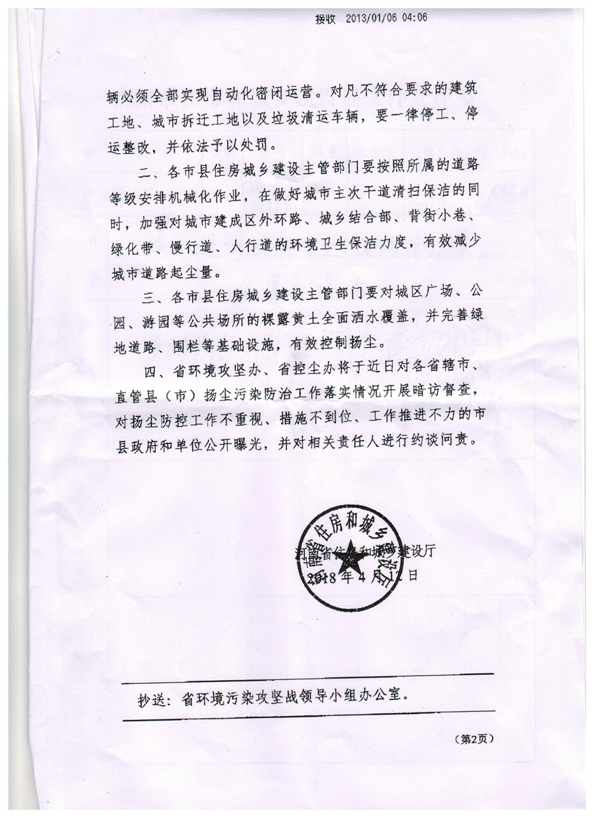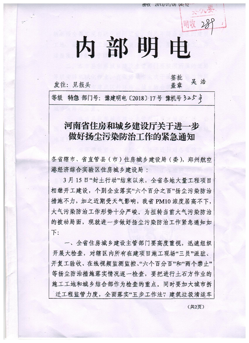 現(xiàn)將《河南省住房和城鄉(xiāng)建設(shè)廳關(guān)于進(jìn)一步做好揚(yáng)塵污染防治工作的緊急通知》(豫建明電[2018]17號(hào))轉(zhuǎn)發(fā)給你們,請(qǐng)按照通知要求,認(rèn)真貫徹執(zhí)行。