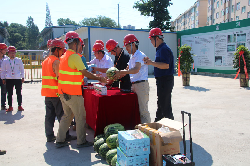 隨后,信陽市政府、住建局、揚塵治理攻堅辦、安監(jiān)站、質(zhì)監(jiān)站等主要領(lǐng)導(dǎo)及建筑業(yè)同行來到現(xiàn)場觀摩會分會場(我公司承建的信陽南灣琨御府項目)參觀,住建局張奔局長還代表信陽市住建局向項目部農(nóng)民工發(fā)放了慰問品。