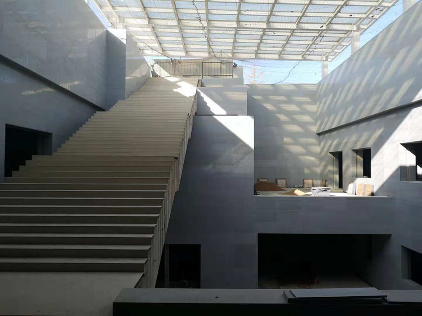 (1)干掛班組,負(fù)一層南北落客區(qū)及展廳花崗巖干掛及收邊收口全部完成。