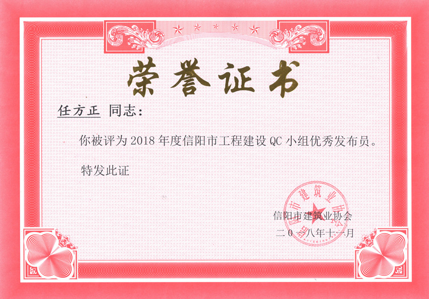 因成績(jī)突出,公司被信陽(yáng)市建協(xié)評(píng)為2018年度信陽(yáng)市工程建設(shè)QC小組活動(dòng)優(yōu)秀企業(yè),公司BIM中心員工任方正被評(píng)為優(yōu)秀發(fā)布員。