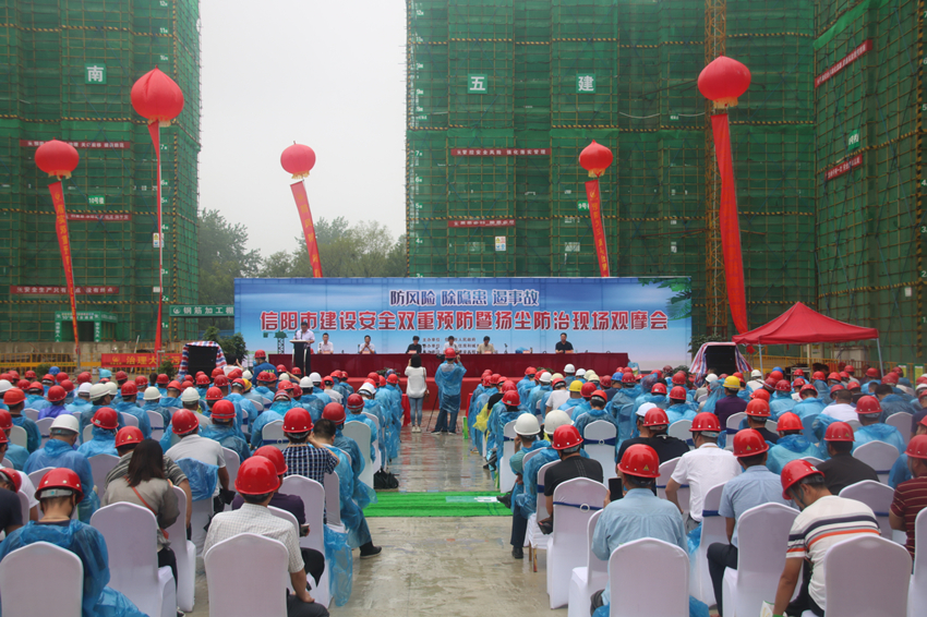 6月19日上午,信陽市建設(shè)安全雙重預(yù)防暨揚(yáng)塵防治現(xiàn)場觀摩會在我公司泰陽辰項目施工現(xiàn)場順利召開。信陽市政府副秘書長葉中洲;市建設(shè)局黨組書記、局長張立英、分管副局長張奔;市環(huán)境攻堅辦副主任、環(huán)保局副局長邱華僑;市住建局建管科科長鄒存亮、安監(jiān)站站長馬其峰;公司黨委書記、董事長、總經(jīng)理吳萬仁等領(lǐng)導(dǎo)出席會議,參加觀摩會的還有各縣、區(qū)住建局(委)分管安全生產(chǎn)、揚(yáng)塵治理工作的副局長(主任)、安監(jiān)站長、揚(yáng)塵防治辦主任;市區(qū)三級以上(含三級)房屋建筑施工企業(yè)主要負(fù)責(zé)人;市中心城區(qū)在建房屋建筑工地項目經(jīng)理、項目總監(jiān)代表等共400余人。