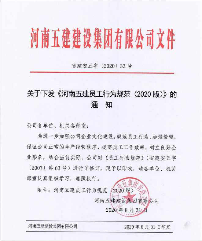 關于下發(fā)《河南五建員工行為規(guī)范(2020版)》的通知