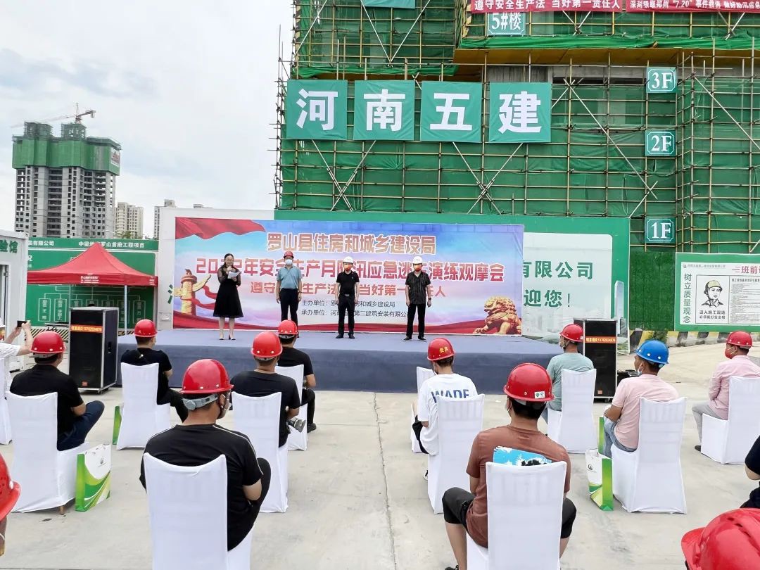 6月26日,羅山縣住建系統(tǒng)2022年“安全生產(chǎn)月防”汛應(yīng)急逃生演練觀摩會在公司第三項(xiàng)目部承建的羅山中梁首府項(xiàng)目順利舉辦。羅山縣住房和城鄉(xiāng)建設(shè)局副局長楊長進(jìn)、建筑工程安全指導(dǎo)站站長陳軍、公司副總經(jīng)理吳建功以及羅山縣建筑施工企業(yè)安全負(fù)責(zé)人、在建項(xiàng)目經(jīng)理、項(xiàng)目安全負(fù)責(zé)人參加活動。