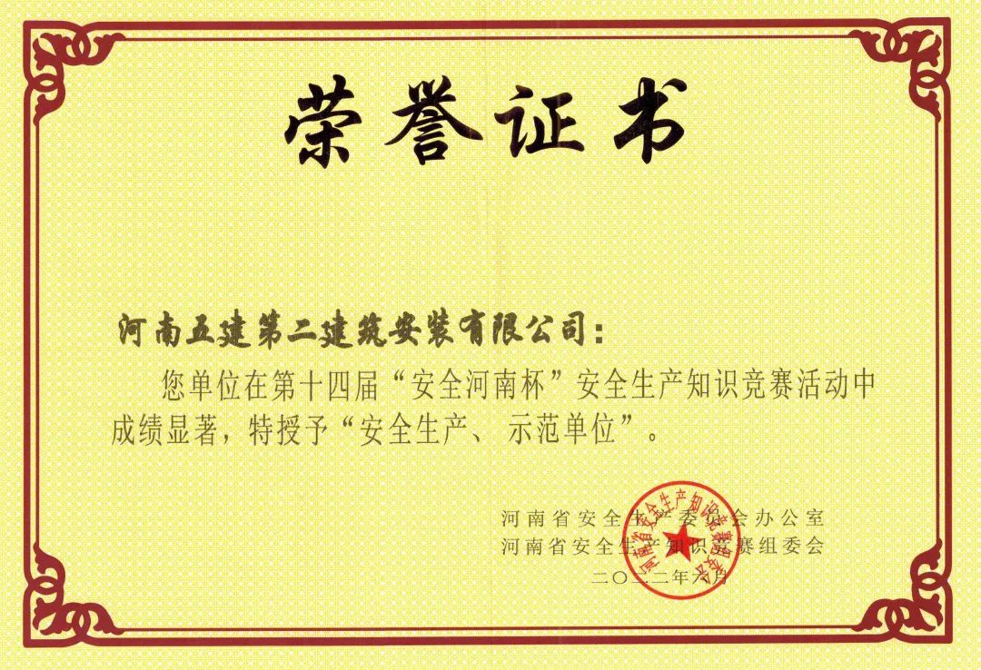 功夫不負(fù)有心人,在公司領(lǐng)導(dǎo)和全體項目員工的努力下,我們在安全生產(chǎn)工作上再創(chuàng)佳績,彰顯了我單位安全管理人員工作認(rèn)真和專業(yè)知識的扎實(shí)。公司在河南省安全生產(chǎn)委員會開展的第十四屆“安全河南杯”安全生產(chǎn)知識競賽中榮獲安全生產(chǎn)示范單位。在河南省建筑業(yè)協(xié)會開展的河南省建筑施工安全生產(chǎn)知識競賽活動,并取得了優(yōu)秀組織單位,公司工程部劉培望同志取得個人三等獎佳績。